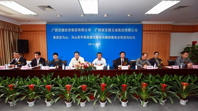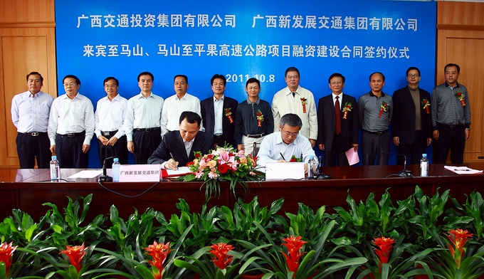10月8日,集團公司和廣西交通投資集團公司來賓至馬山、馬山至平果高速公路項目融資建設合同簽約儀式在南寧舉行。自治區交通運輸廳廳長潘巍、總工程師王劼耘;集團公司董事長、黨委書記朱堅和,總經理李定倫,黨委副書記、紀委書記張友坐,副總經理劉明洪,總會計師鄧遠志,總工程師覃炳賢;交投集團副董事長、總經理、黨委副書記劉可,黨委副書記、紀委書記羅斯卡,副總經理韋昌鴻、廉向東,及雙方有關部門、直屬各單位負責人參加了簽約儀式。