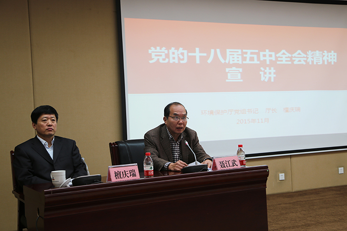 自治區(qū)環(huán)境保護(hù)廳廳長(zhǎng)檀慶瑞作宣講,自治區(qū)國(guó)資委副主任、黨委副書記、巡視員聶江武主持宣講會(huì)。