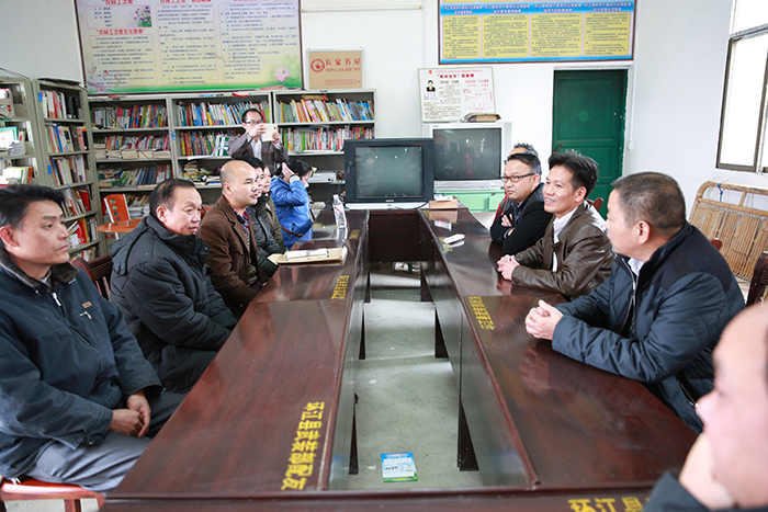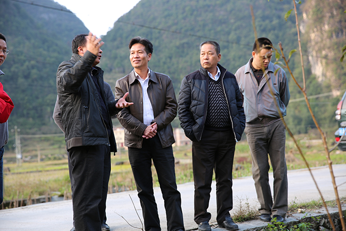 集團公司朱堅和董事長(左三)、張友坐副書記(右一)聽取駐村”第一書記“梁義寬匯報工作。 在相堯村、豹山村、才帛村,朱堅和董事長分別與當地鎮、村干部以及覃獻康、梁義寬、蔣博三位派駐農村“第一書記”和扶貧工作隊隊員進行親切交談,詳細詢問“第一書記”工作、生活情況,并聽取了“第一書記”關于幫扶村的黨建及村集體經濟發展情況匯報。得知目前各駐村書記及扶貧工作隊員已經完成精準扶貧入戶摸底調查時,朱堅和董事長對“第一書記”到村以來,深入調查走訪,積極幫助村里理思路、定規劃、辦實事,表示充分肯定。