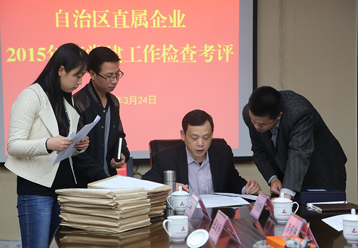 3月24日,自治區國資委2015年度黨建工作考評小組對我集團公司2015年度黨建工作進行實地檢查。自治區國資委副主任王曉華帶隊開展檢查考評,我集團公司黨委書記、董事長朱堅和在迎檢分工會上作黨建工作情況匯報,集團公司在家領導以及相關部門人員參加會議。