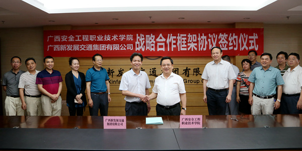 黎志逘祝賀雙方正式建立戰(zhàn)略合作伙伴關系。他說,廣西安全工程職業(yè)技術學院是經廣西壯族自治區(qū)人民政府批準成立、教育部備案的公辦全日制普通高等職業(yè)學院,隸屬廣西壯族自治區(qū)安全生產監(jiān)督管理局管理,是廣西唯一一所、全國第三所專門培養(yǎng)安全類高等專業(yè)技術人才的現(xiàn)代化職業(yè)學院。為了深入貫徹黨的十八屆六中全會和習近平總書記、李克強總理關于安全生產工作的重要指示批示精神,推動企業(yè)落實安全生產主體責任,在全社會凝聚弘揚安全發(fā)展理念、支持安全生產的共識,“十三五”期間乃至更長一個時期,雙方將建立互信、互補、互援的戰(zhàn)略合作關系,開啟校企全面深入合作的新篇章。通過深入合作交流,促進了廣西安全工程職業(yè)技術學院發(fā)展,提升了廣西新發(fā)展交通集團有限公司在安全生產方面的實力,最終實現(xiàn)雙方的共贏。