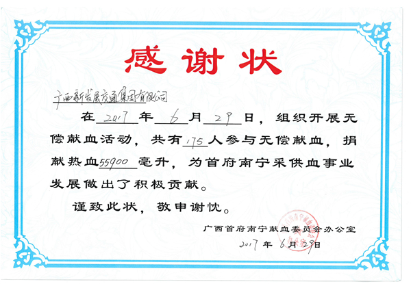 南寧獻(xiàn)血管理委員會充分肯定了新發(fā)展交通集團黨員群眾踴躍參與獻(xiàn)血,積極投身公益事業(yè)的行為,并向集團公司贈送了感謝狀。