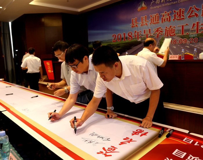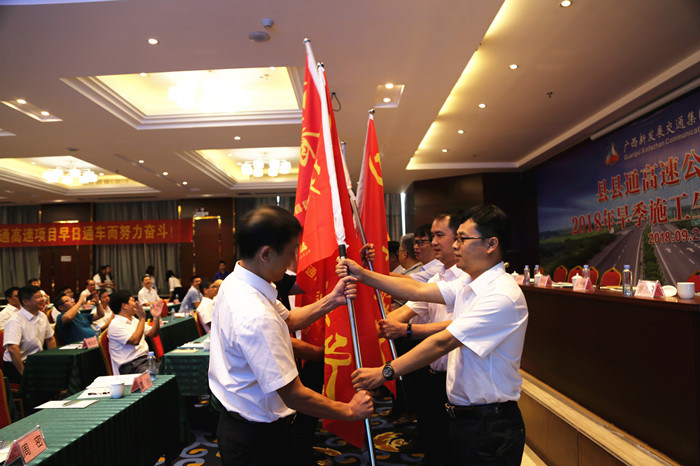 會上,與會領導為各參建單位代表授“黨員先鋒隊”及“青年突擊隊”旗子。會上還開展了旱季施工質量安全承諾簽字活動。